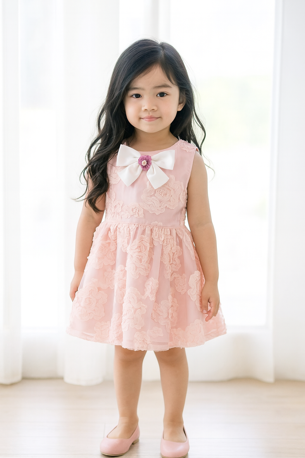 A sweet pastel pink dress covered in soft 3D rosette appliqués for a charming, girly look. Designed with a lightweight mesh overlay, comfy lining, and a sparkly bow accent at the neckline. Perfect for little girls who love twirl-ready, floral styles for everyday moments.