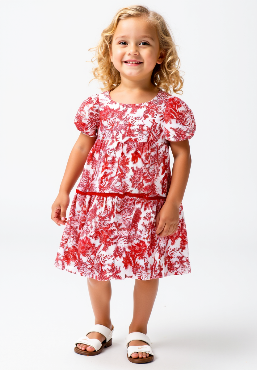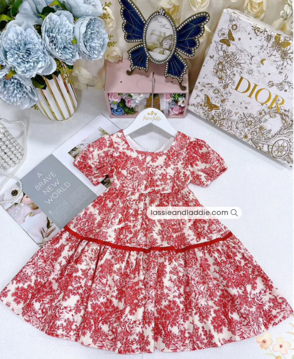 This Dior-inspired dress showcases a timeless red Toile de Jouy print on a pristine white background, exuding classic Parisian charm. The tiered skirt with a delicate red trim adds an extra touch of elegance, making it perfect for special occasions.