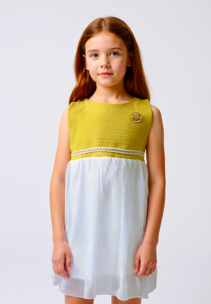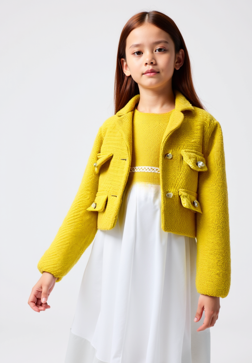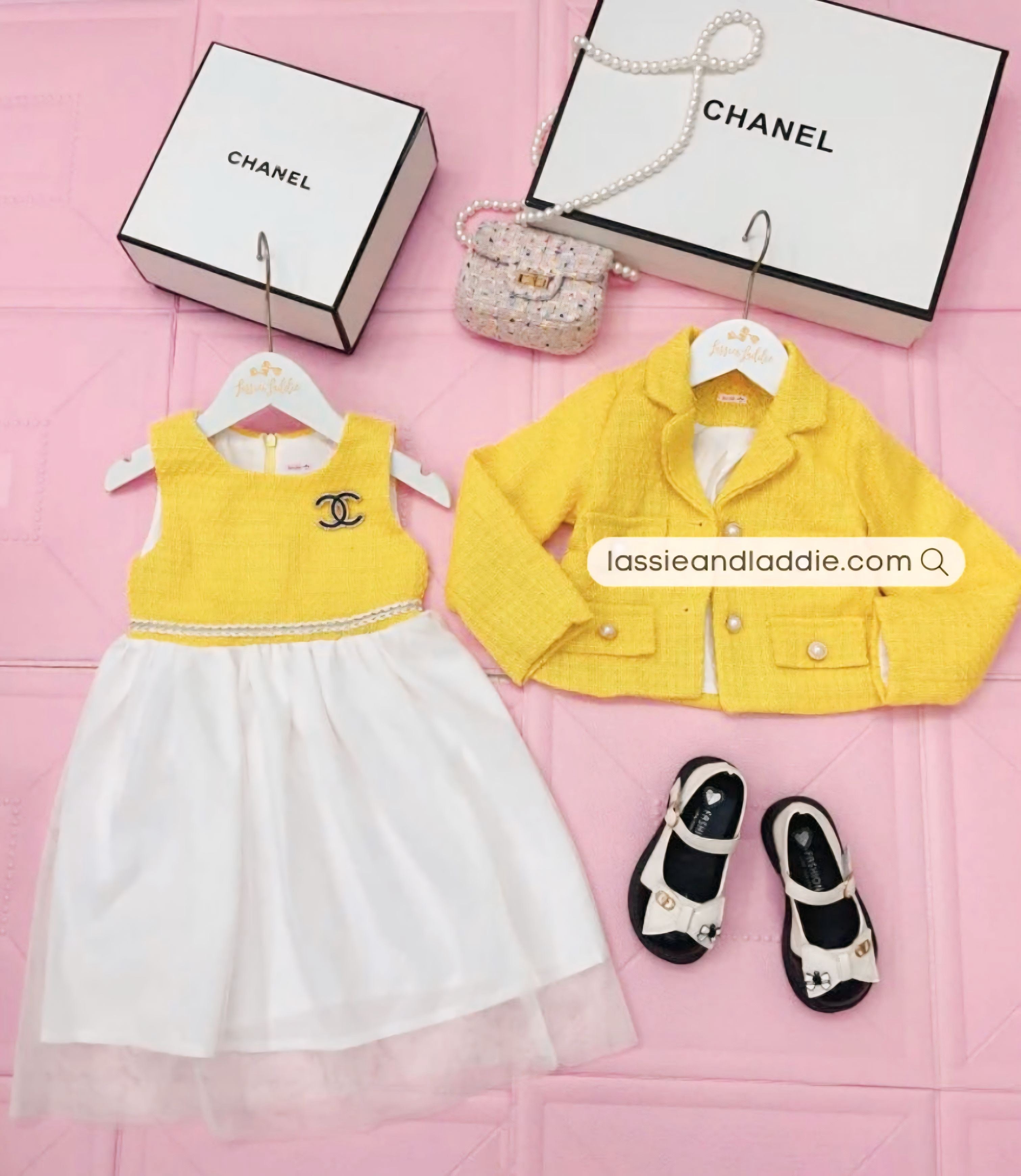 Add a pop of sunshine to your little one’s wardrobe with this vibrant yellow tweed and white dress set. Featuring a sleeveless dress with a flowy white skirt and a matching tweed cardigan, this ensemble is perfect for cheerful, sophisticated occasions.