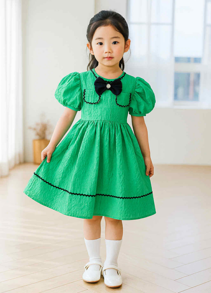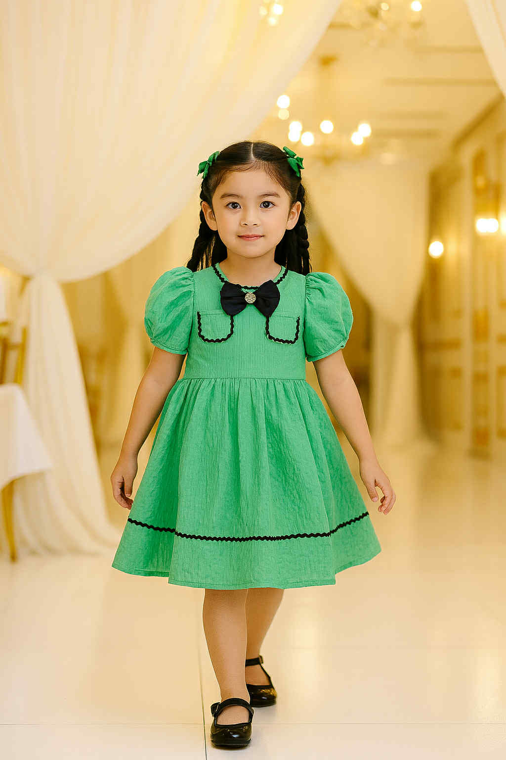 The Camille Dress – Timeless Charm captures the beauty of classic elegance with a playful twist. Designed with puff sleeves, scalloped trims, and a twirl-worthy skirt, it’s a piece that little girls will love to wear again and again. A statement black bow adorned with a golden brooch adds sophistication, making it the perfect outfit for birthdays, family gatherings, and special celebrations.