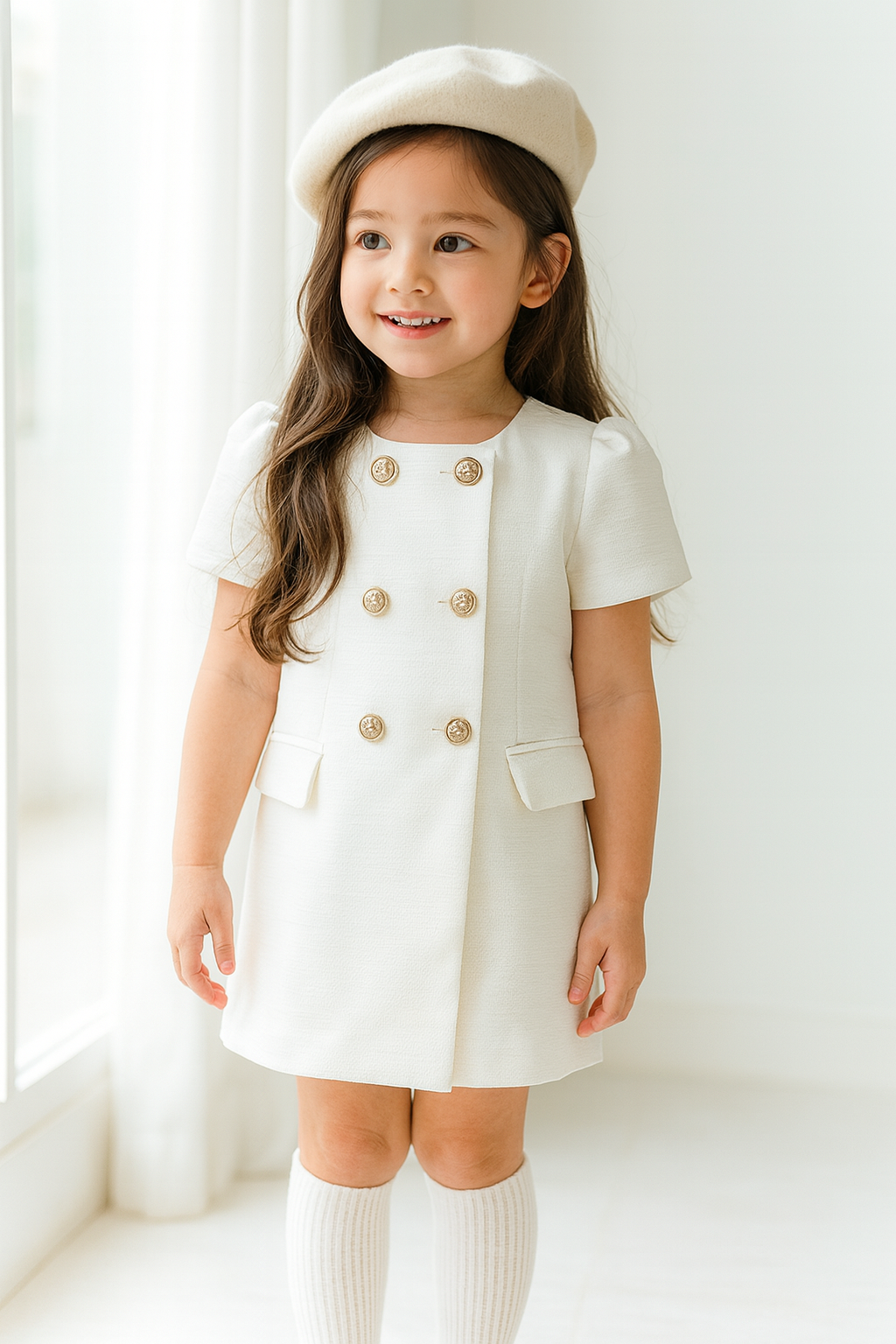 The Ivy Double-Breasted Dress is where timeless tailoring meets little-lady charm. Designed with a structured silhouette and chic blazer-inspired details, it features gold button accents, flap pockets, and a detachable bow with a delicate flower centerpiece. Whether in soft blush pink or classic white, Ivy is the perfect piece for adding sophistication to her wardrobe.