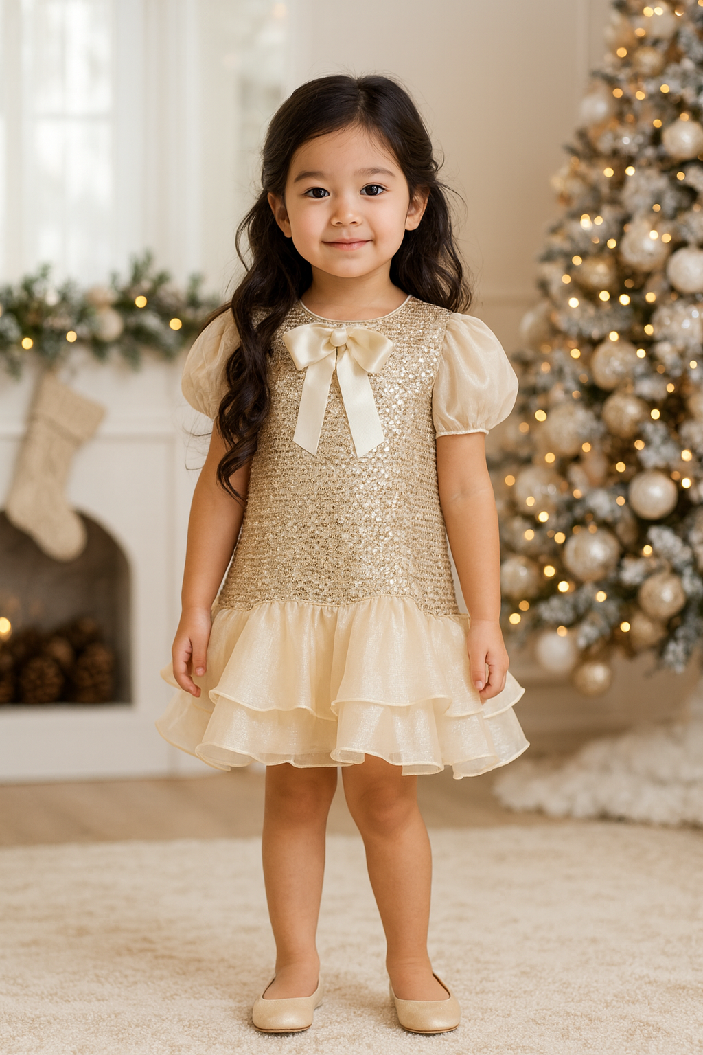 The Alessia Lumière Ruffle Dress- Beige is made for little girls who love to shine. Designed with a glimmering sequin bodice, puffed sleeves, and a dreamy layered ruffle hem — it’s the perfect mix of sparkle and sweetness. The soft inner lining ensures comfort while keeping that luxurious, polished look Lassie & Laddie is known for.