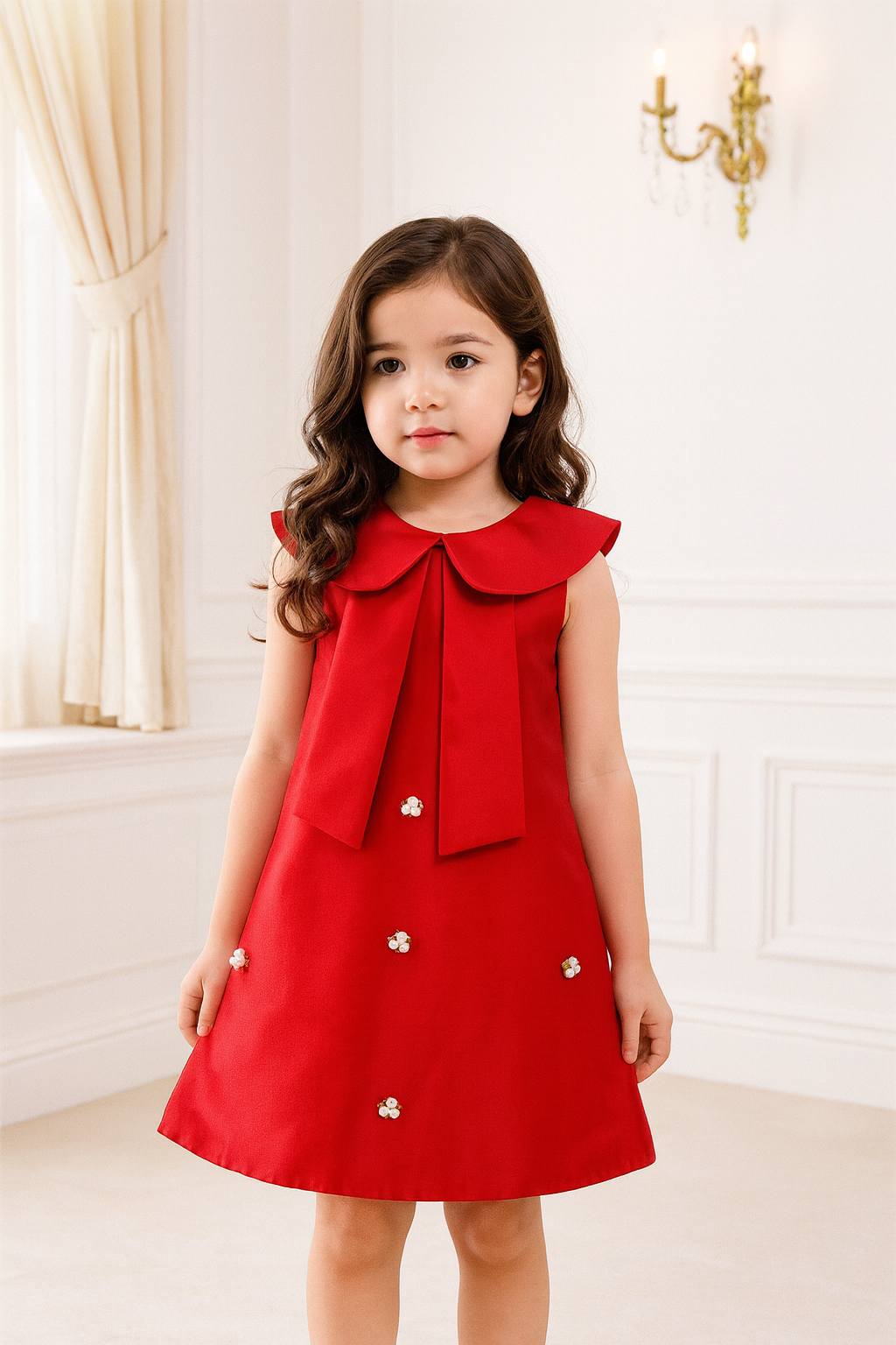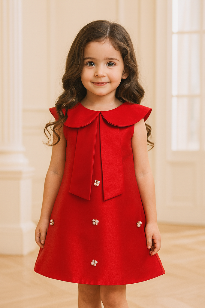 The Allison Pearl Bow Dress- Blush Pink is a refined statement of timeless beauty — designed with a glossy satin finish, oversized front bow, and dainty pearl flower embellishments. Its structured A-line silhouette and signature Peter Pan collar create a look that’s both sophisticated and endearing, making it the perfect holiday and celebration piece for your little darling.
