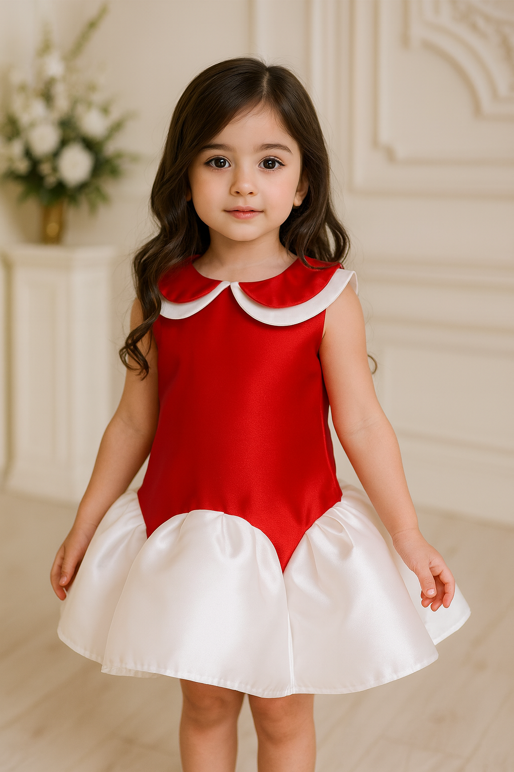 The Suzette Petaline Red Dress is a chic and whimsical piece crafted from premium satin, featuring a contrast Peter Pan collar and voluminous petal-like hem. Its structured silhouette and glossy finish give it a luxurious feel while keeping the design youthful and fun — a perfect choice for little girls who love to stand out with grace.