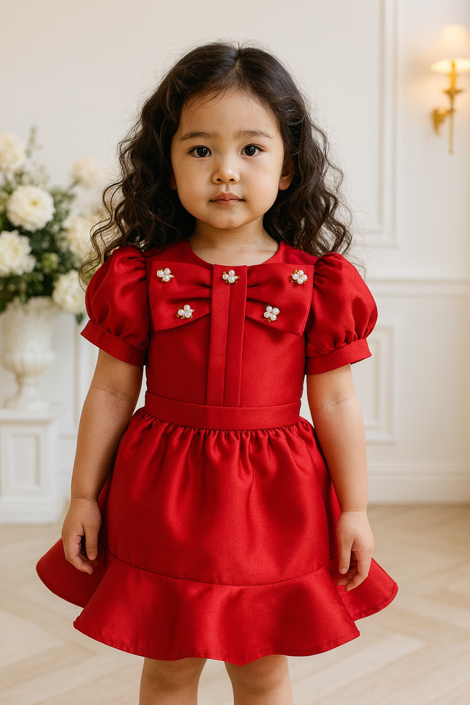 A modern twist on timeless elegance β the Ingrid Red Bloom Coords combine sophistication and comfort in one darling set. Crafted from smooth, high-quality satin, it features a puff-sleeve top adorned with an oversized bow detailed with dainty πΈ pearl-flower embellishments, paired with a flared ruffle skirt that moves gracefully with every step.