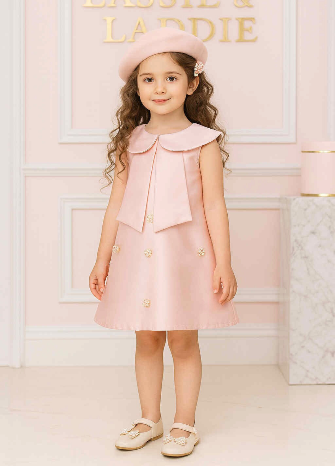 The Allison Pearl Bow Dress- Blush Pink is a refined statement of timeless beauty — designed with a glossy satin finish, oversized front bow, and dainty pearl flower embellishments. Its structured A-line silhouette and signature Peter Pan collar create a look that’s both sophisticated and endearing, making it the perfect holiday and celebration piece for your little darling.